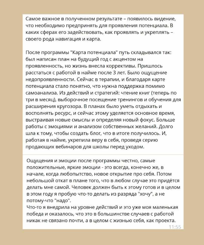 — свежий взгляд на свою уникальность, распаковка слепых зон и возвращение внутренней силы. Возможность увеличить доход благодаря выходу на новый виток.