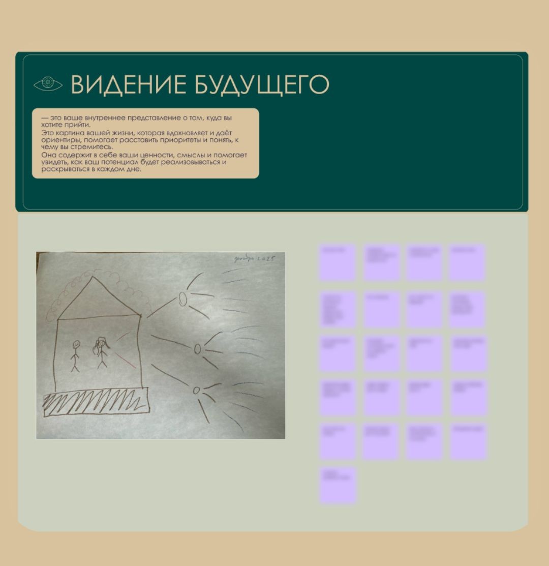 На этом этапе мы сформируем вдохновляющее ви́дение реализации, зададим стратегический вектор, и разобьём его на понятные шаги, чтобы ваши цели перестали быть абстрактными мечтами и превратились в реалистичный маршрут.